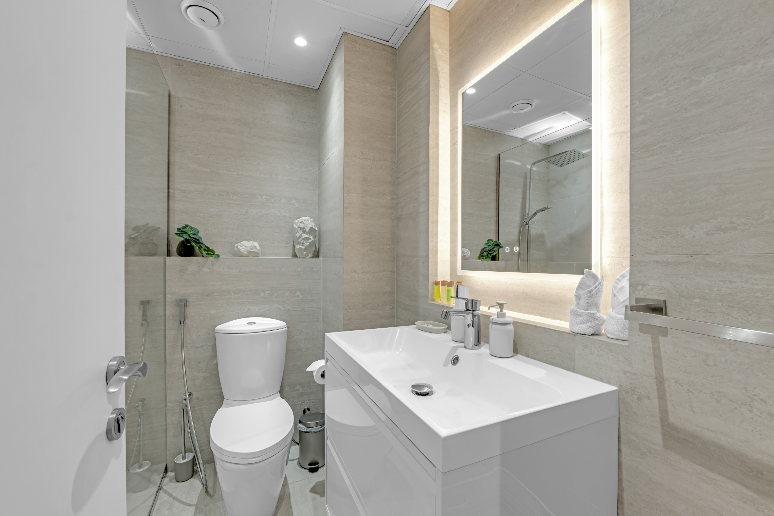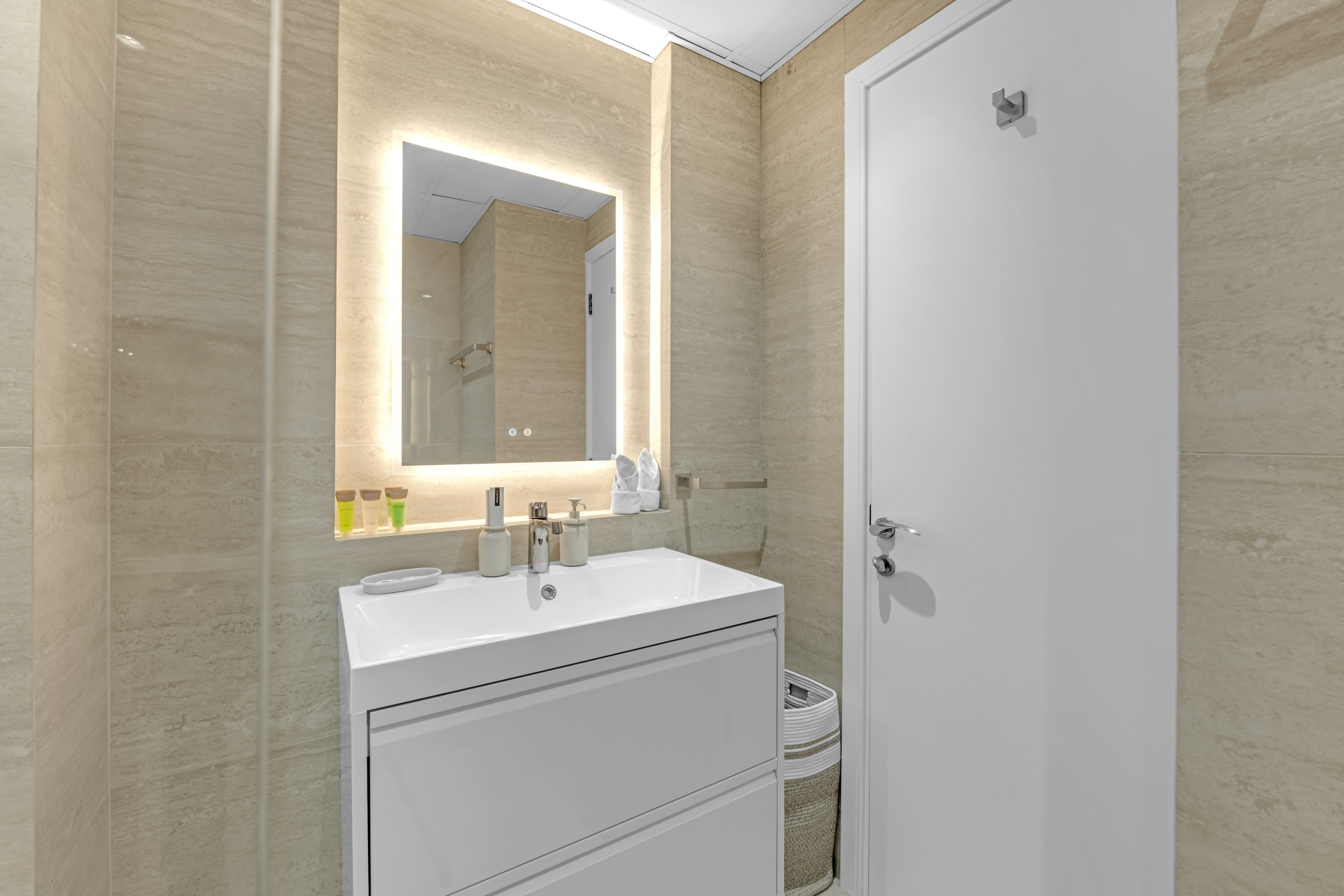- الأساسيات (المناشف، الوسائد، بياضات السرير، صابون، ورق المرحاض)